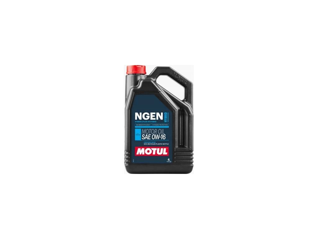 MOTUL NGEN HYBRID 0W-16 je motorový olej špeciálne vyvinutý pre moderné hybridné vozidlá (H.E.V. a P.H.E.V.) a benzínové motory s častým režimom štart/stop. Formulácia so zameraním na nízke trenie a veľmi nízku viskozitu optimalizuje účinnosť motora pri nízkych teplotách oleja a rieši technické výzvy hybridných systémov — riedenie palivom, emulziu vody a veľký počet spínaní motora. Tento produkt je súčasťou udržateľného konceptu Motul: obsahuje 25 % prémiových regenerovaných základových olejov (100 % obnoviteľné syntetické základové látky rastlinného pôvodu) a je balený do plechovky vyrobenej zo 50 % recyklovaného materiálu (100 % recyklovateľná).
