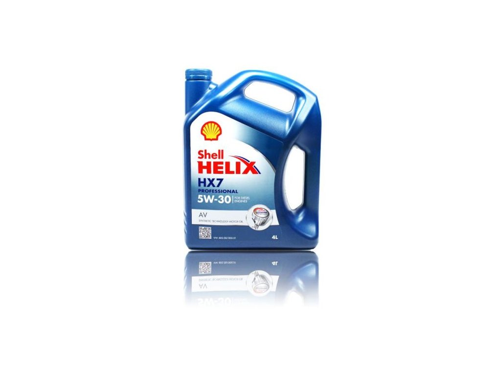 SHELL HELIX HX7 PROFESSIONAL AV 5W-30 je nový názov pre SHELL HELIX HX7 DIESEL 5W-30 AV je syntetický, ľahkobežný motorový olej vhodný pre preplňované naftové motory. Mimoriadne vhodný je pre motory VW so systémom čerpadlo tryska (PD) pri štandardných intervaloch výmeny oleja 15 000 km. Použitím oleja SHELL HELIX HX7 PROFESSIONAL AV 5W-30 je zaručená dokonalá ochrana motora, rýchli nábeh mazania pri studených štartoch, vysoká čistota a zníženie spotreby paliva.